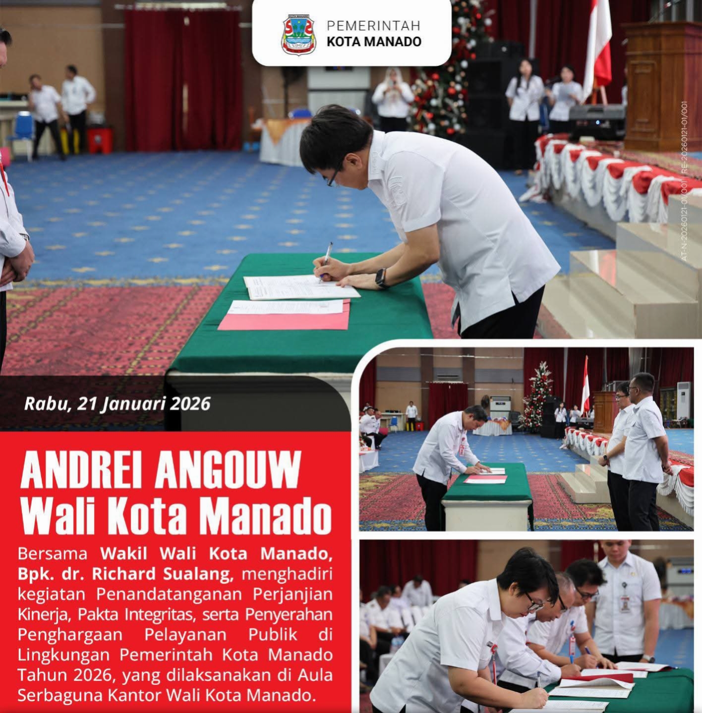 Terkait hal ini Wali Kota Manado, Andrei Angouw, bersama Wakil Wali Kota Manado, dr. Richard Sualang, menghadiri kegiatan Penandatanganan Perjanjian Kinerja, Pakta Integritas, serta Penyerahan Penghargaan Pelayanan Publik di Lingkungan Pemerintah Kota Manado Tahun 2026, yang dilaksanakan di Aula Serbaguna Kantor Wali Kota Manado.